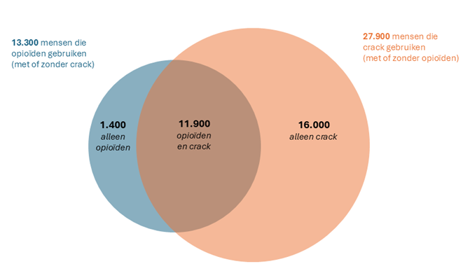 Ruim tien jaar geleden waren opiaten, zoals heroïne, de meest gebruikte drugs in deze groep. Uit het OPAAK-onderzoek blijkt echter dat crack de opiaten inmiddels heeft verdrongen als meest gebruikte drug. In 2023 gebruikten naar schatting 13.300 mensen in Nederland problematisch opiaten, waarvan 89% óók crack gebruikte. Het aantal mensen dat crack gebruikte, werd geschat op ongeveer 27.900, waarvan zo’n 16.000 alleen crack en geen opiaten gebruikten. Opvallend is dat driekwart van de mensen die alleen crack gebruikten ook nog nooit eerder regelmatig opiaten had gebruikt. Dit wijst erop dat we mogelijk met een nieuwe groep crackgebruikers te maken hebben, die niet zijn overgestapt van opiaten naar crack.