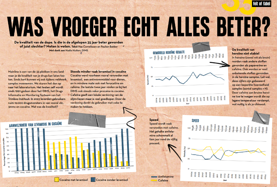 We vroegen het aan het Drugs Informatie en Monitoring Systeem (DIMS) van het Trimbos Instituut. Mainline is namelijk één van de 33 plekken in ons land waar je de kwaliteit van je drugs kunt laten testen. Sinds kort kunnen wij ook tijdens veldwerk samples meenemen. We sturen het dan op naar het laboratorium. Het testen zelf wordt al sinds 1992 door het DIMS gedaan. Nadia Hutten, projectmedewerker Drugsmonitoring en beleid bij het Trimbos instituut dook voor ons in de cijfers.